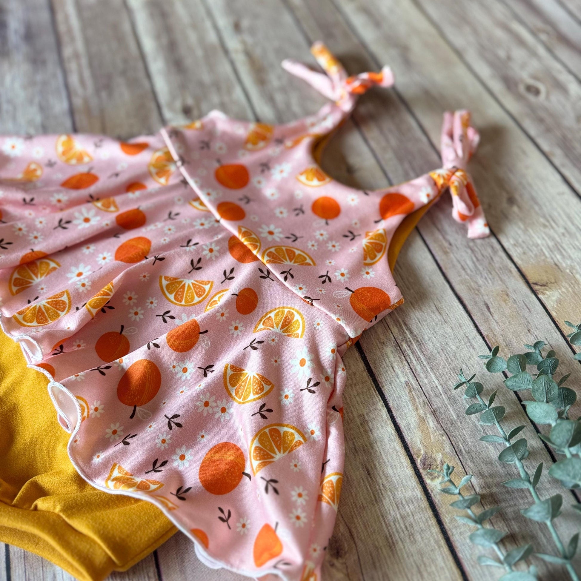 This baby girl tie strap skirted fruit bubble romper is made from a soft double brush polyester material. Perfect outfit to make a little girl's first birthday sweeter for their "One Little Cutie" or a clementine/orange theme party! If not for a birthday, it is perfect for everyday play wear. A unique outfit that you won't be able to find anywhere else. This kids jumper has adjustable tie straps. The fabric has a beautiful drape and the skirt has a fun twirl factor. The main portion of the fabric is a light pink with tiny white daisies, oranges and orange slices throughout. The bottom portion and the lining of the bodice is done with a mustard yellow color to match the yellows and oranges in the main fabric.