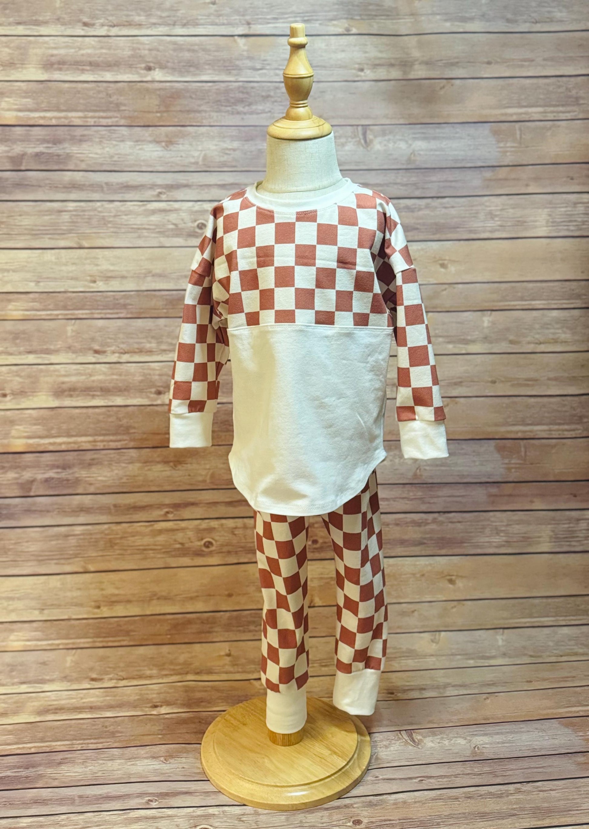 Kids gender neutral checkered long sleeved pullover tee is the perfect piece for fall for your little one. It is made from cotton spandex jersey. The fabric is so soft and comfortable, your kiddo is going to love it. All seams are professionally serged. The colors throughout the fabric are brown and ivory checkers. If you want to make this a complete outfit, be sure to add the joggers that are listed under the joggers listing. This outfit is one of a kind and perfect for the changing season.