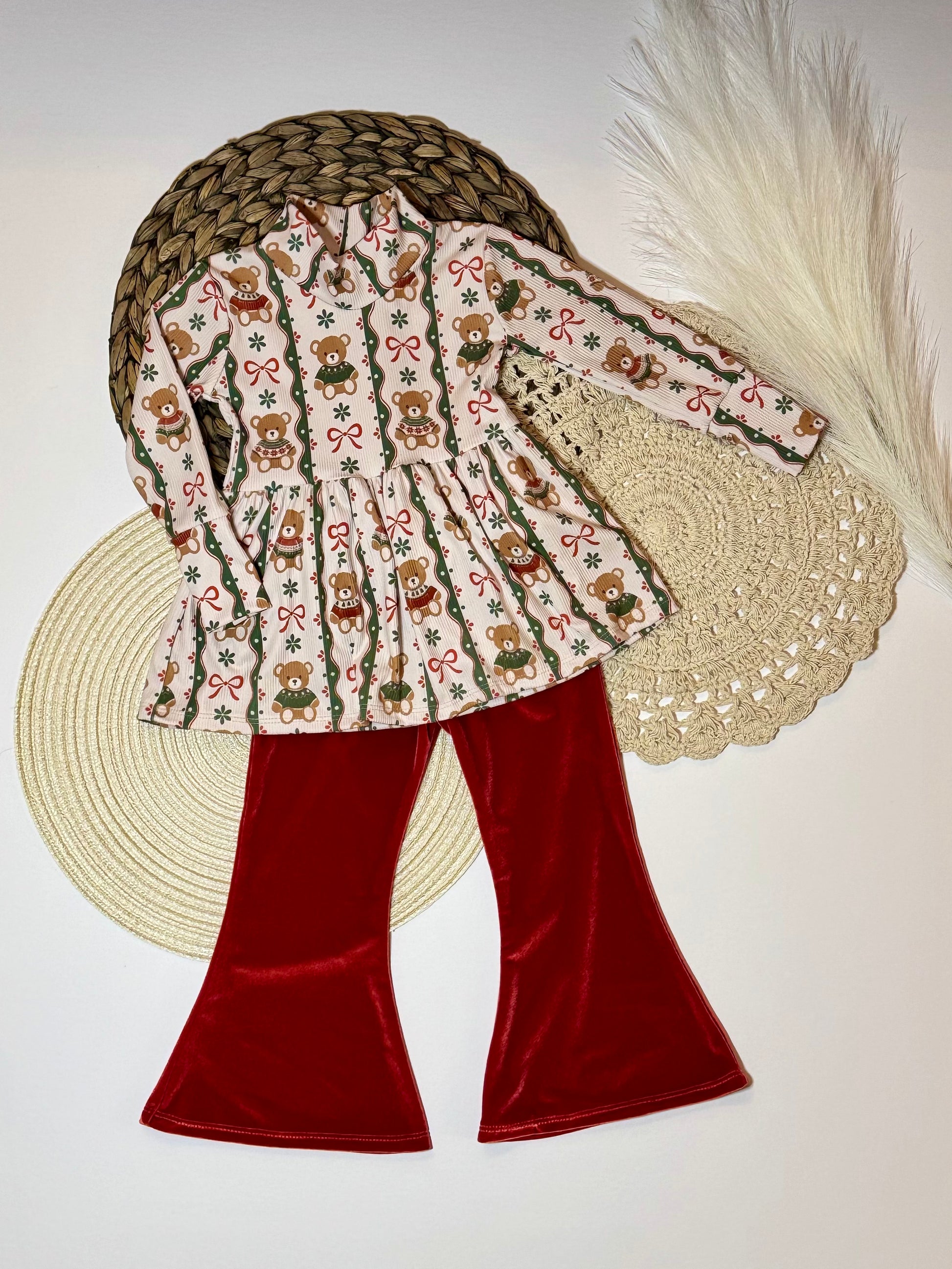 🎄 Girls Christmas Teddy Bear Peplum Top – Holiday Long Sleeve Outfit