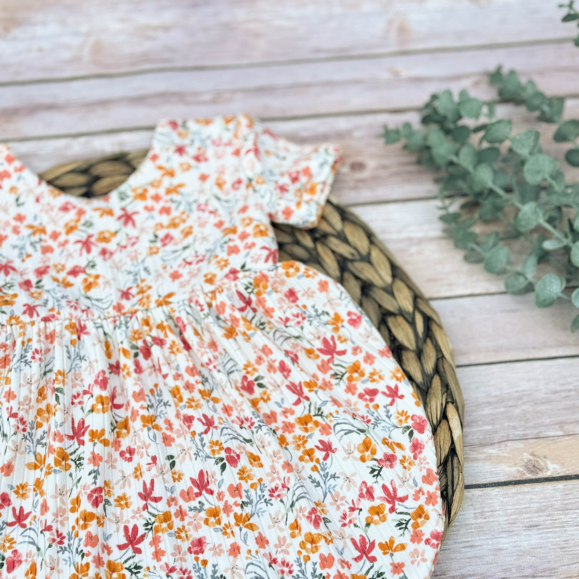 The spring floral bubble romper is made from a soft ribbed knit fabric. The baby girl romper has a criss cross opening for easy dressing and removal. There is also two sleeve options to choose from for this outfit. You can choose to have the romper made short sleeved or long sleeve. Also, you have the option to add a chunky bow to complete the ensemble.