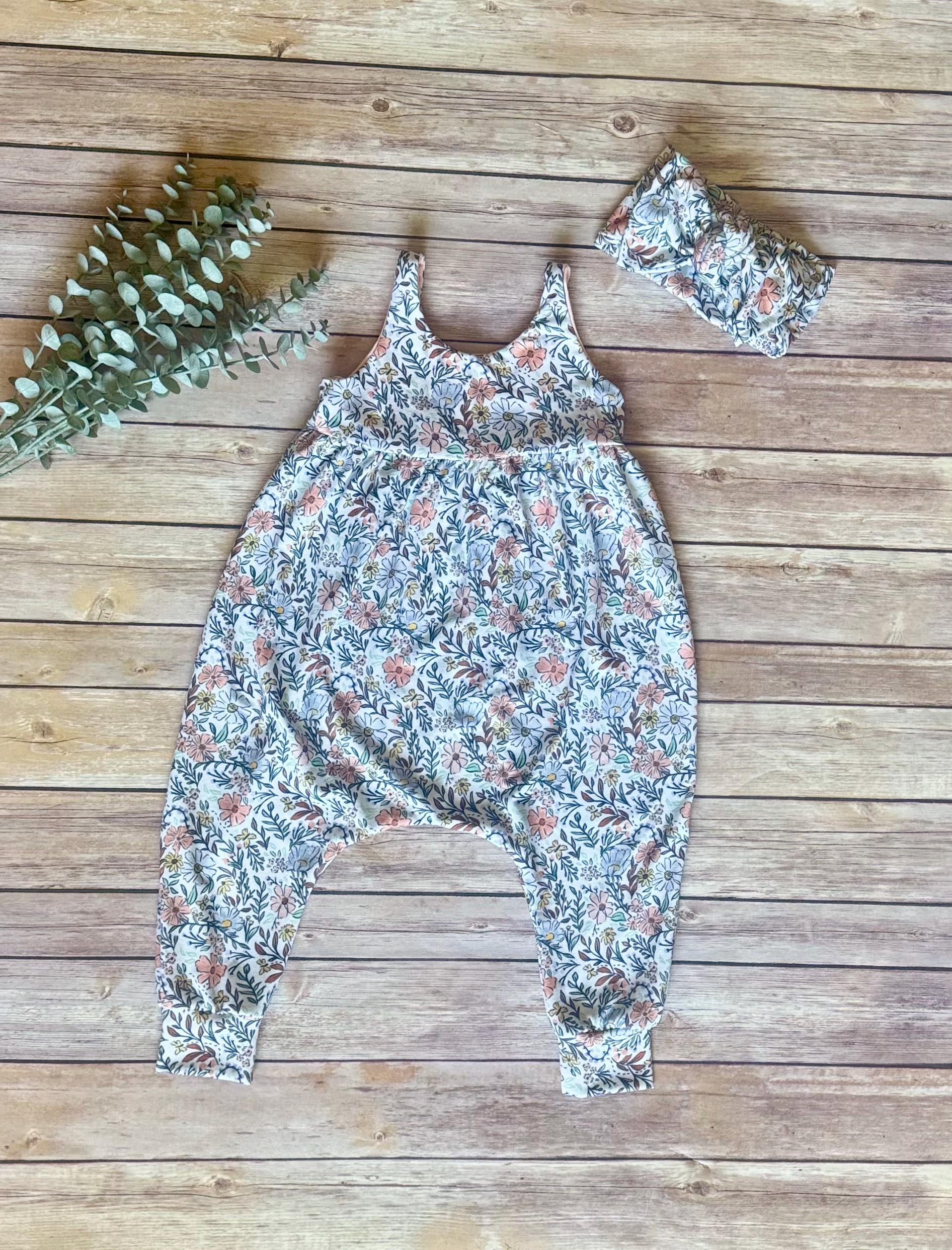 Floral Baby Romper: blue and yellow one piece outfit, baby girl jumpsuit