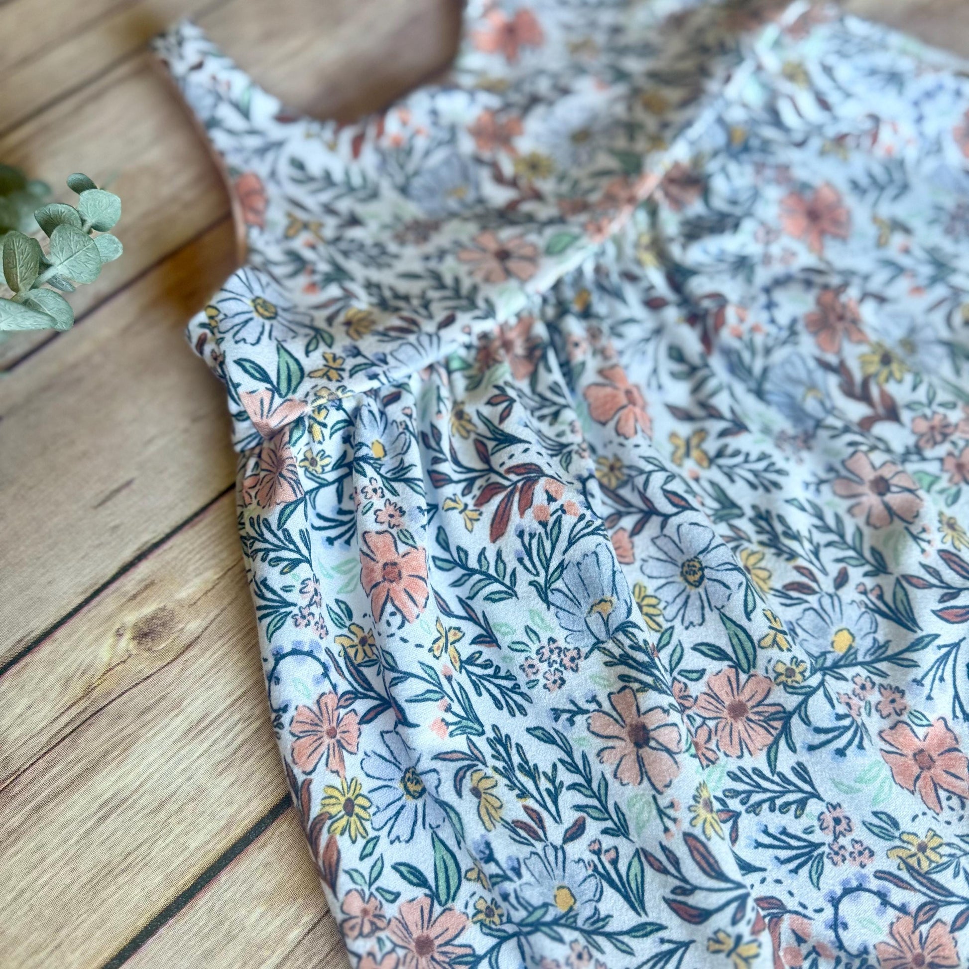 The floral jumpsuit romper is so cute and can be worn year round by layering it with a shirt underneath on cooler days. During the hot months it can be worn as a tank top romper. The colors consist of yellow, pink and blue flowers. The fabric type used for this jumper is a soft double brush polyester, which has beautiful drape. You also have the option to add a chunky bow to the outfit to complete the ensemble by choosing Bow in the drop down.