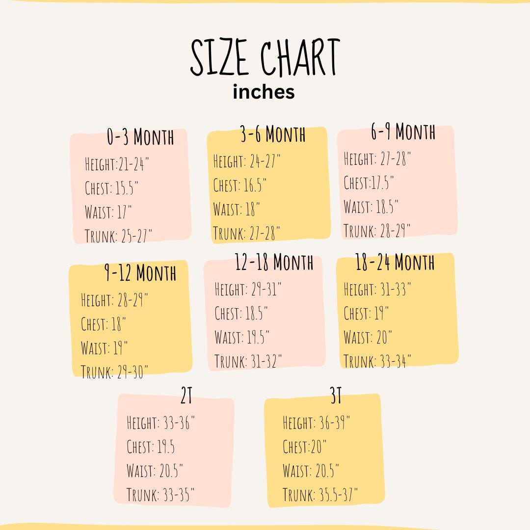 If you are unsure which size to purchase please check the size chart in the last photo of this listing. If your child is between sizes, it is recommended to size down on the sizing chart. You are always welcome to send me your Childs measurements and I will customize the size to fit your child.